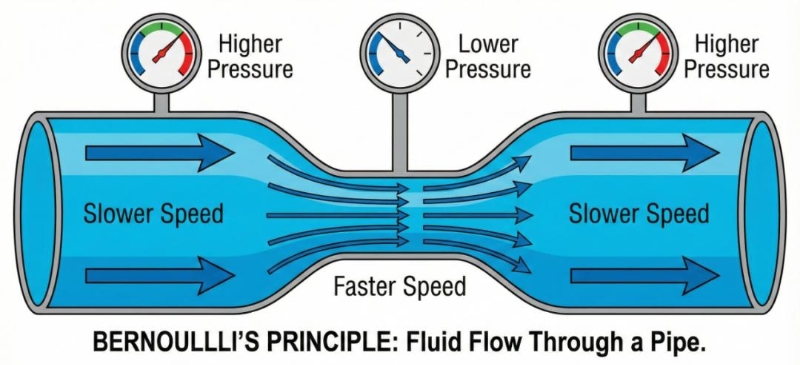 (Illustration: When a fluid flows through a narrow area, its speed rises sharply and the pressure drops sharply.)