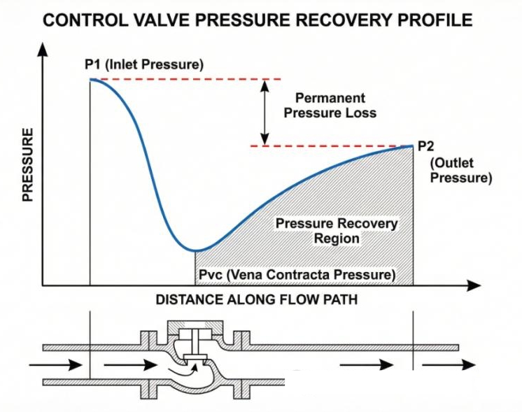 After fluid passes the vena contracta, the flow path expands. Velocity decreases, and pressure begins to rise again. This phenomenon is called pressure recovery.
