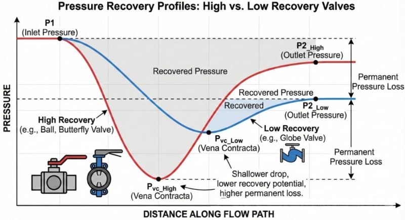 (Illustration: High Recovery Valve is a ball Valve/butterfly valve, and the pressure curve drops deeper; Low Recovery Valve is a stop valve, and the pressure curve is flatter.)